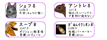 スープ (♀) Lv : 47.0 Hp : 230 忠誠心 : 20